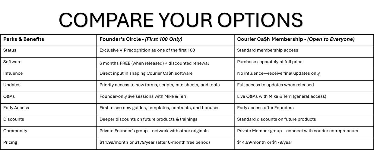 Whether you’re a Founder’s Circle VIP or a Standard Member, every subscription begins with the Courier Ca$h Paperback Guide - $49.97 on Amazon. The Guide is your entry point—the foundation you’ll need before diving into the tools, software, and community support that Courier Ca$h provides.